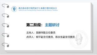 主题研讨阶段由档案学教指委副主任委员南京大学吴建华教授主持,档案学教指委副主任委员南开大学柯平教授、中山大学陈永生教授点评。云南大学胡莹副教授、上海大学王丽华副教授、湘潭大学王协舟教授、中国人民大学牛力副教授分别代表四家2019年获评国家级一流本科专业介绍专业建设情况。档案学教指委副主任委员南开大学柯平教授和档案学教指委副主任委员中山大学陈永生教授分别对四所学校的建设特色和经验进行了点评。